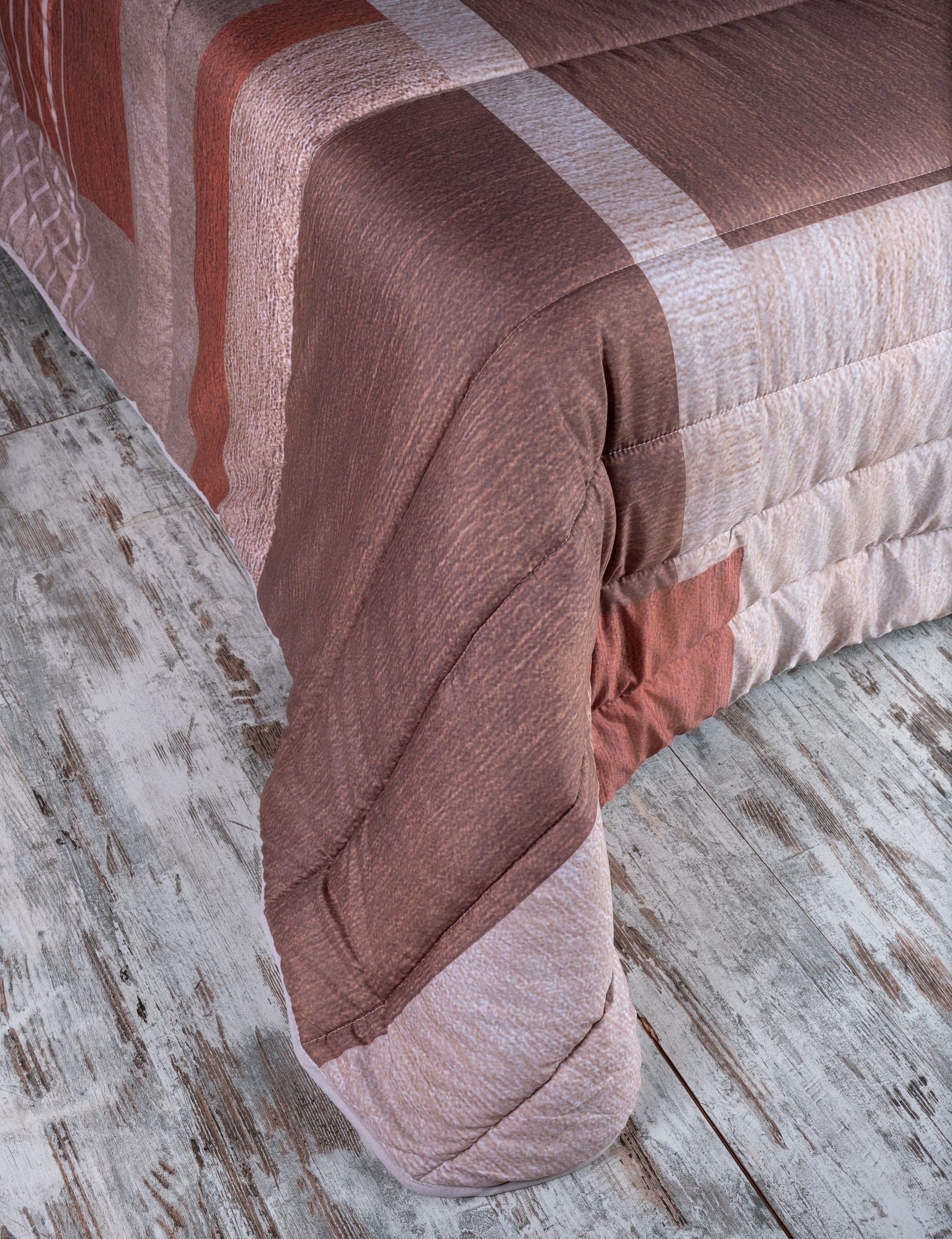 Su diseño geométrico en tonos tierra, marrones y rojizos aporta un toque actual y equilibrado a la habitación. Las líneas y bloques de color crean un efecto visual elegante y armónico, perfecto para quienes buscan un edredón con personalidad y que combine fácilmente con diferentes estilos decorativos.