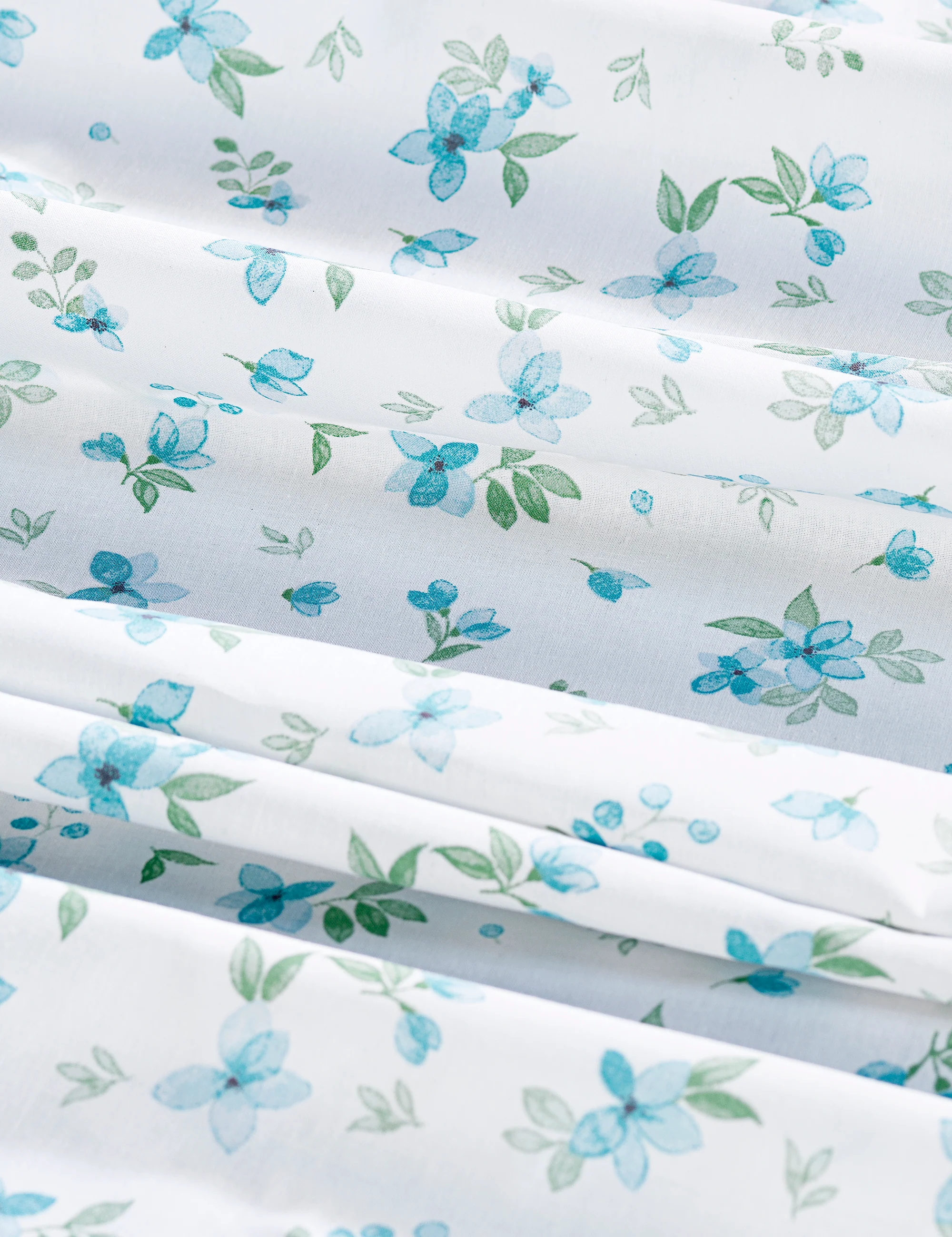 El estampado floral en tonos azules y verdes sobre fondo blanco aporta un toque de frescura y naturalidad, ideal para crear un ambiente relajante y acogedor.